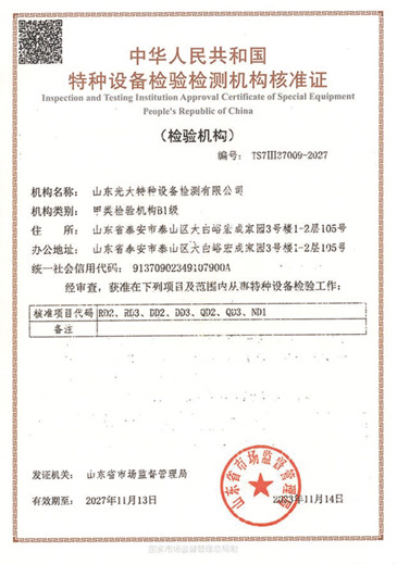 山東光大特種設(shè)備檢測(cè)有限公司是經(jīng)山東省市場(chǎng)監(jiān)督管理局核準(zhǔn)的甲類B1特種設(shè)備綜合檢驗(yàn)機(jī)構(gòu)。2017年9月30日取得了山東省市場(chǎng)監(jiān)督管理局頒發(fā)的《檢驗(yàn)檢測(cè)機(jī)構(gòu)資質(zhì)認(rèn)定證書》。2018年2月22日取得了山東省市場(chǎng)監(jiān)督管理局頒發(fā)的《特種設(shè)備檢驗(yàn)檢測(cè)機(jī)構(gòu)核準(zhǔn)證》(起重機(jī)械)檢驗(yàn)檢測(cè)資質(zhì)。2021年11月取得山東省市場(chǎng)監(jiān)督管理局版發(fā)的《特種設(shè)備檢驗(yàn)檢測(cè)機(jī)構(gòu)核準(zhǔn)證》(安全閥在線、離線)校驗(yàn)資質(zhì)。2023年11月取得山東省市場(chǎng)監(jiān)督管理局頒發(fā)的甲類檢驗(yàn)機(jī)構(gòu)B1《特種設(shè)備檢驗(yàn)檢測(cè)機(jī)構(gòu)核準(zhǔn)證》,具有壓力容器(RD2...